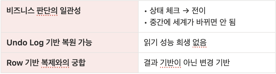 Redo Log (WAL)→ 커밋된 변경은 반드시 디스크에 남음Undo Log + MVCC→ 다른 트랜잭션은 이전 스냅샷 조회 가능Crash Recovery→ 서버 다운 후에도 커밋 상태 복원
