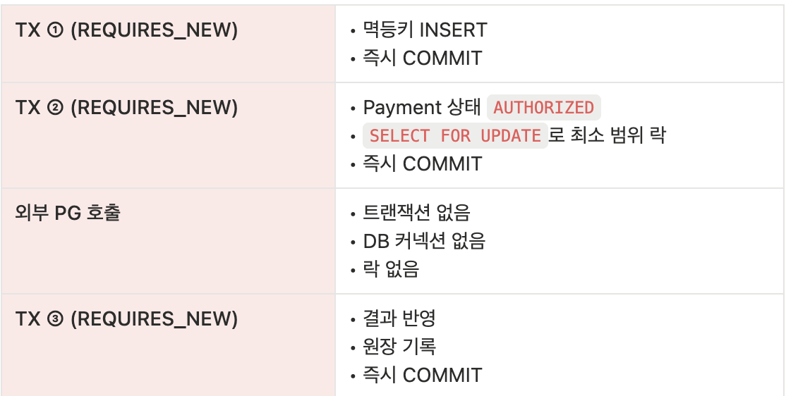 이 구조 덕분에 DB 커넥션 점유 시간 ↓ 락 유지 시간 ↓ 장애 확산 범위 ↓ 를 유지할 수 있습니다.