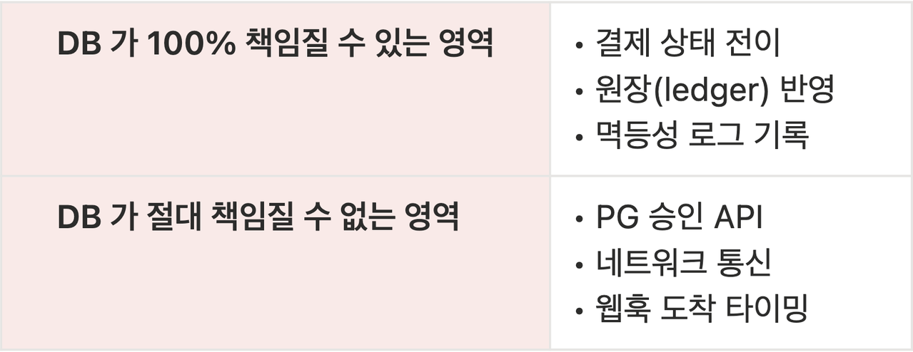 DB 트랜잭션은 오직 DB 내부 상태만 되돌릴 수 있습니다. 네트워크 요청, 외부 서버의 처리 결과, 카드사의 승인 상태는 ROLLBACK 대상이 아니라는 사실을 망각했던 겁니다.