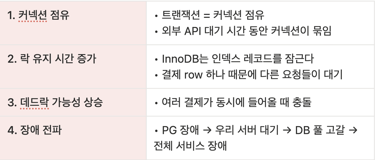 그런데 결제에서는 외부 I/O가 반드시 끼어들고, 외부 I/O는 우리가 통제할 수 없습니다. 즉, 트랜잭션이 길어지면 다음 상황이 구조적으로 발생합니다.